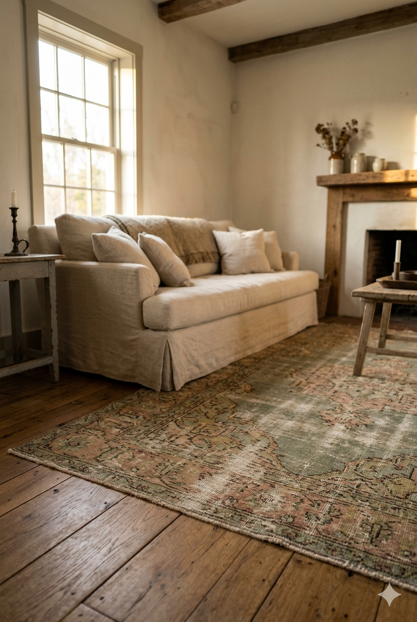 A beautifully faded, distressed area rug instantly grounds a small room and gives it that “lived-in” farmhouse soul. Look for muted tones like dusty rose, faded navy, or soft sage green to add a pop of subtle color without overwhelming the space. The intricate, worn-out patterns draw the eye downward, making the floor space feel larger while providing a soft, plush landing pad for bare feet.