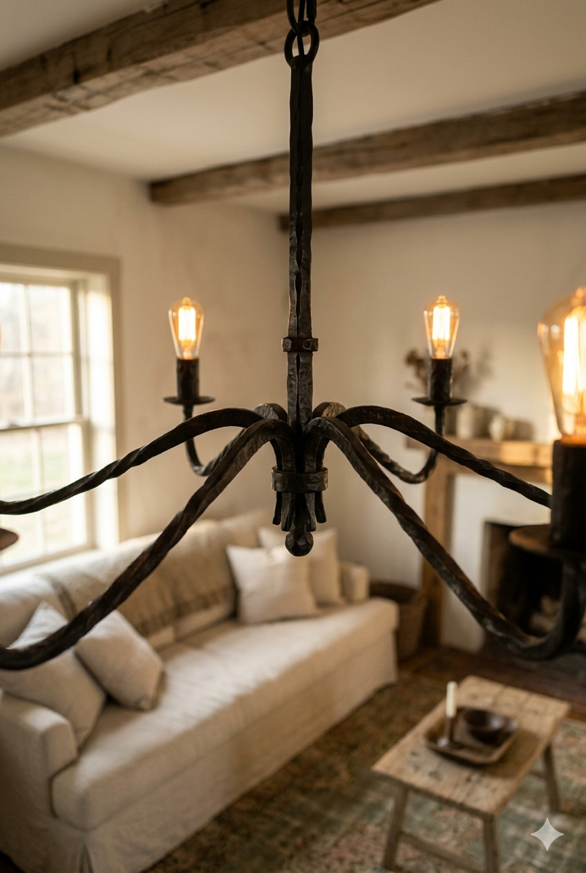Lighting makes or breaks a small space. Swap out builder-grade flush mounts for a simple, rustic wrought iron chandelier or an industrial-inspired pendant light. The dark, matte metal provides a stunning contrast against soft neutral walls and fabrics, injecting a touch of modern farmhouse edge without taking up any physical space in the room.